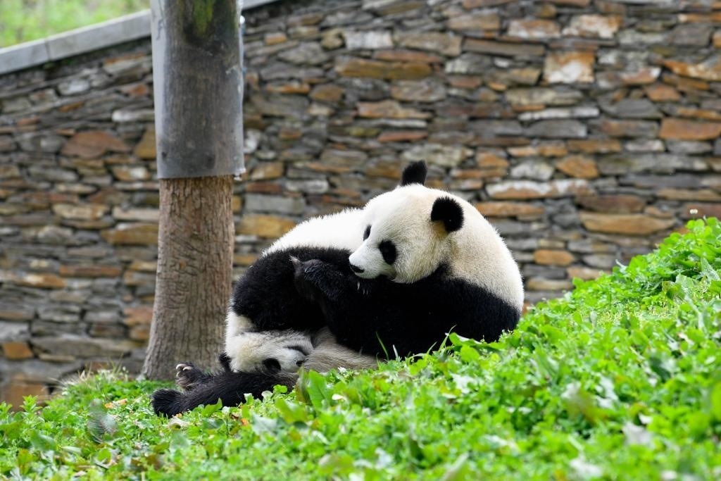 2022年4月24日,在中國(guó)大熊貓保護(hù)研究中心臥龍神樹(shù)坪基地內(nèi)拍攝的大熊貓。新華社記者 胥冰潔 攝
