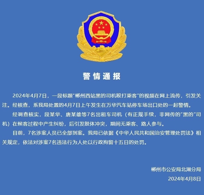 經(jīng)調(diào)查核實(shí),段某華、唐某雄等7名出租車司機(jī)(有正規(guī)手續(xù),非網(wǎng)傳的“黑的”司機(jī))在候客過程中產(chǎn)生糾紛,后引發(fā)肢體沖突,期間無乘客、路人參與。