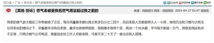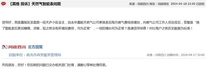 中新網(wǎng)4月17日電(中新財(cái)經(jīng)記者 吳濤)近日,在“問政四川”平臺上,不少網(wǎng)友反映“更換新表后燃?xì)赓M(fèi)異常上漲”,這些留言顯示來自四川成都、自貢、廣安、南充等多地,僅僅在4月16日,保守估計(jì)就有十幾條;17日上午又出現(xiàn)十幾條。大部分尚未得到回復(fù),部分獲得官方回復(fù)稱“留言已轉(zhuǎn)交給相關(guān)機(jī)構(gòu)進(jìn)行處理”。