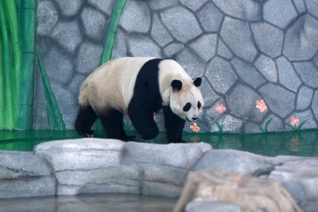 繼續(xù)前行進(jìn)入大熊貓2號(hào)館,便能看到園內(nèi)唯一的雌性大熊貓“曼蘭”。今年7歲的它“兩耳不聞窗外事”,疾步快走,不停地在館舍內(nèi)繞圈子。住在它隔壁的6歲雄性大熊貓“滿(mǎn)滿(mǎn)”則鏡頭感十足,當(dāng)游客拿出手機(jī)拍攝時(shí),它趴在地上吐舌頭“賣(mài)萌”,不一會(huì)又變換姿勢(shì),攀上木樁玩耍,吸引眾多游客紛紛按下快門(mén),記錄它活潑可愛(ài)的一面。