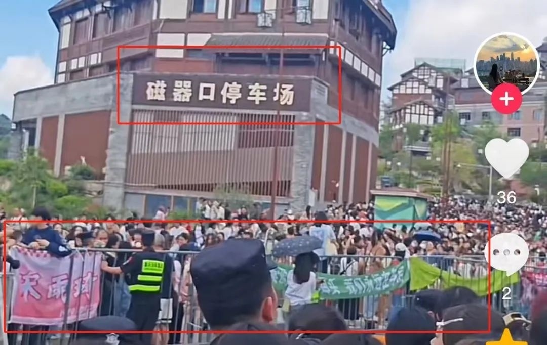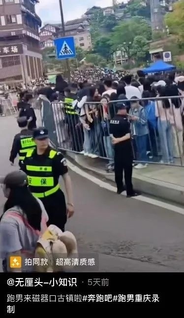 根據(jù)視頻顯示的“磁器口停車場”檢索視頻平臺相關(guān)內(nèi)容,有不少網(wǎng)友在4月19日發(fā)布了綜藝節(jié)目《奔跑吧》在當(dāng)?shù)劁浿茣r的畫面,通過比對可以發(fā)現(xiàn),網(wǎng)傳視頻中出現(xiàn)的圍欄、安保分布情況、以及圍欄上懸掛的不同顏色應(yīng)援橫幅等元素都與路人拍攝的清晰版視頻一致。