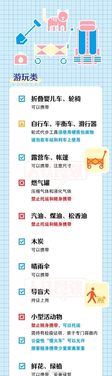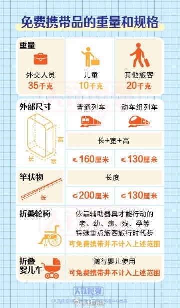 坐火車出游的小伙伴請注意!有些物品過不了安檢,出發(fā)前趕快篩查行李單,隨手轉(zhuǎn)發(fā)?、侔b密封完好、標(biāo)志清晰且酒精體積百分含量大于或者等于24%、小于或者等于70%的酒類飲品累計(jì)不超過3000毫升。②充電寶標(biāo)志清晰,單塊額定能量不超過100Wh。③自噴壓力容器,單體容器容積不超過150毫升,每種限帶1件,累計(jì)不超過600毫升。④含易燃成分的非自噴壓力容器日用品,單體容器容積不超過100毫升,每種限帶1件。