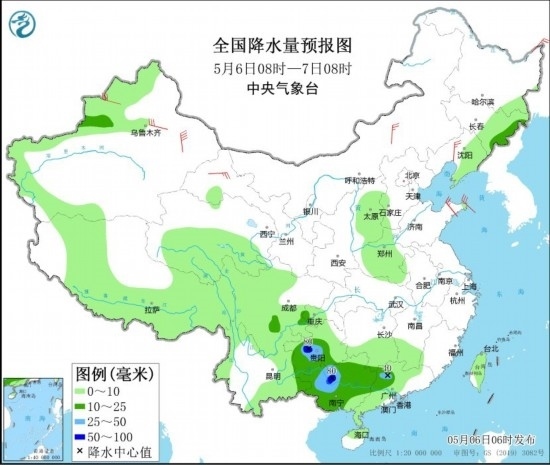 全國降水量預(yù)報(bào)圖(5月6日08時(shí)-7日08時(shí))