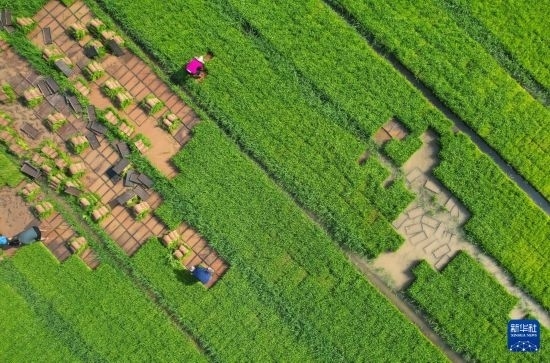 5月5日,在四川省內(nèi)江市東興區(qū)長江現(xiàn)代農(nóng)業(yè)園區(qū),農(nóng)民在集中育秧基地起秧苗(無人機(jī)照片)。