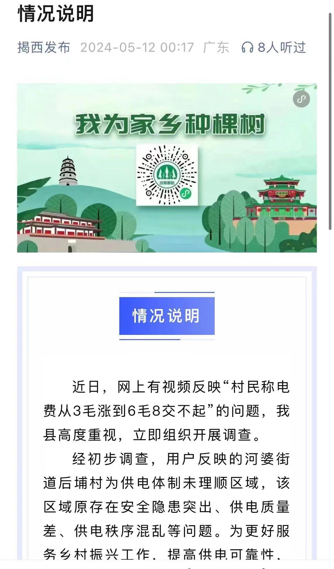 針對(duì)此事,“揭西發(fā)布”微信公眾號(hào)于5月12日發(fā)布了情況說(shuō)明,表示對(duì)網(wǎng)上反映的“村民稱電費(fèi)從3毛漲到6毛8交不起”的問(wèn)題高度重視,并已立即開展調(diào)查。