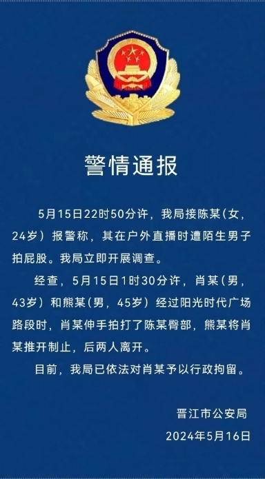 ·晉江警方通報(bào)“殘疾女子街頭直播遭男子拍臀”:男子被行拘。