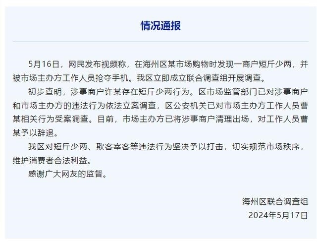 ·連云港通報海鮮商販“鬼秤”事件:涉事商戶被清理出場。