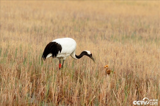黑龍江省齊齊哈爾市扎龍國家自然保護(hù)區(qū),國家一級保護(hù)動物野化的一對丹頂鶴夫妻成功孵化一個丹頂鶴寶寶,丹頂鶴夫妻蘆葦蕩里叼著食物喂小寶寶,丹頂鶴寶寶毛茸茸的非??蓯邸?/p>