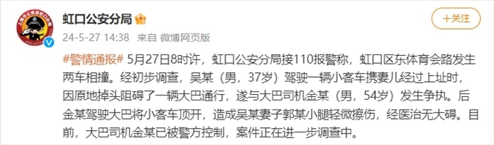 央視網(wǎng)消息:上海市公安局虹口分局發(fā)布警情通報,5月27日8時許,虹口公安分局接110報警稱,虹口區(qū)東體育會路發(fā)生兩車相撞。經(jīng)初步調查,吳某(男,37歲)駕駛一輛小客車攜妻兒經(jīng)過上址時,因原地掉頭阻礙了一輛大巴通行,遂與大巴司機金某(男,54歲)發(fā)生爭執(zhí)。后金某駕駛大巴將小客車頂開,造成吳某妻子郭某小腿輕微擦傷,經(jīng)醫(yī)治無大礙。目前,大巴司機金某已被警方控制,案件正在進一步調查中。