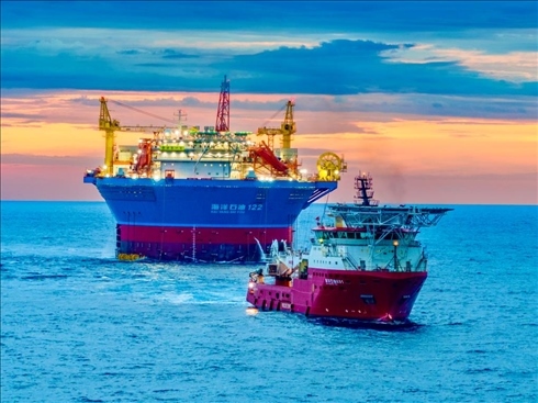 ·我國自主設(shè)計(jì)建造的亞洲首艘圓筒型“海上油氣加工廠”——“??惶枴边\(yùn)抵作業(yè)海域。