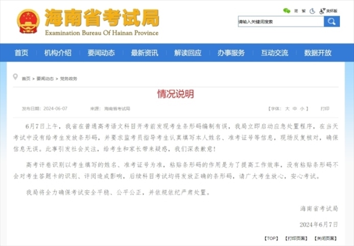 ·海南通報“高考語文卷未發(fā)條形碼”:不影響答題卡識別、評閱。