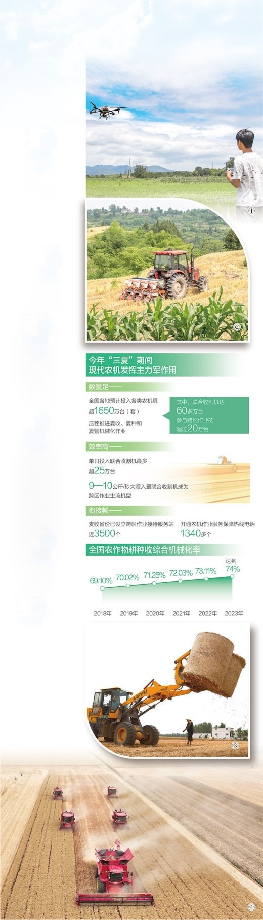 農(nóng)業(yè)現(xiàn)代化離不開農(nóng)業(yè)機(jī)械化。大農(nóng)機(jī)和小農(nóng)機(jī)協(xié)同發(fā)力的背后,折射出農(nóng)業(yè)生產(chǎn)方式不斷轉(zhuǎn)變。今年“三夏”,全國各地預(yù)計(jì)投入各類農(nóng)機(jī)具超1650萬臺(tái)(套),大型大馬力農(nóng)機(jī)、丘陵山區(qū)小型農(nóng)機(jī)等部分機(jī)具初步實(shí)現(xiàn)了“有好農(nóng)機(jī)用”,推動(dòng)農(nóng)業(yè)機(jī)械化邁上新臺(tái)階,全國農(nóng)作物耕種收綜合機(jī)械化率達(dá)到74%,農(nóng)機(jī)作業(yè)面積超過73億畝次。