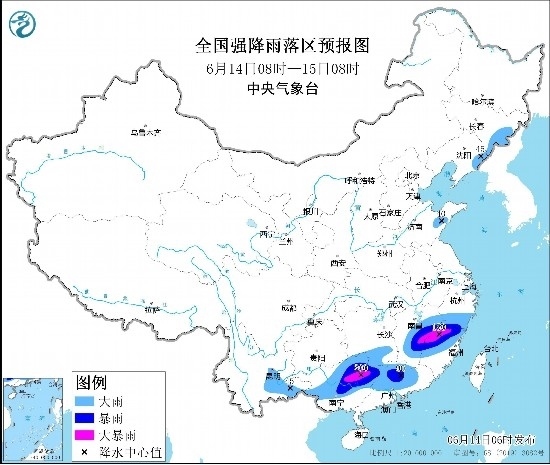 預(yù)計,6月14日08時至15日08時,江西中東部、浙江南部、福建西部和北部、湖南南部、云南東南部、廣西中北部、廣東中北部以及吉林東部、遼寧東北部、山東南部等地部分地區(qū)有大到暴雨,其中,江西東部、福建西北部、廣西東北部等地部分地區(qū)有大暴雨(100~200毫米)。上述部分地區(qū)伴有短時強降水(最大小時降雨量30~50毫米,局地可超過80毫米),局地有雷暴大風或冰雹等強對流天氣。中央氣象臺6月14日06時發(fā)布暴雨黃色預(yù)警(見圖1)。