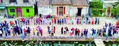 在青田,藝術(shù)讓這個(gè)村落慢慢蘇醒,也讓青田人對(duì)家鄉(xiāng)充滿驕傲與自豪。除了青田水鄉(xiāng)藝術(shù)季、“上善若水——藝術(shù)龍舟行動(dòng)”等活動(dòng),一場(chǎng)“走田”主題時(shí)裝秀,更是點(diǎn)燃了村民的熱情。穿著設(shè)計(jì)師以鄉(xiāng)村生產(chǎn)生活為靈感設(shè)計(jì)的服裝,佩戴著自己親手制作的香云紗配飾,道具是平日田間勞作的老物什,村民“模特”們雖面露羞澀,但走在自己最熟悉的鄉(xiāng)野,走出的是自信、堅(jiān)定的步伐,仿佛在告訴每一個(gè)人,這就是我們的生活,我們的時(shí)尚。