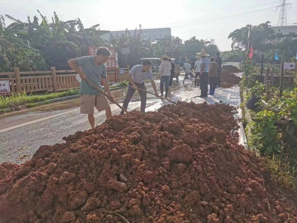 在梧州市長(zhǎng)洲區(qū)長(zhǎng)洲鎮(zhèn)泗洲村,村民在低水位路段加固堤防。(受訪者供圖)
