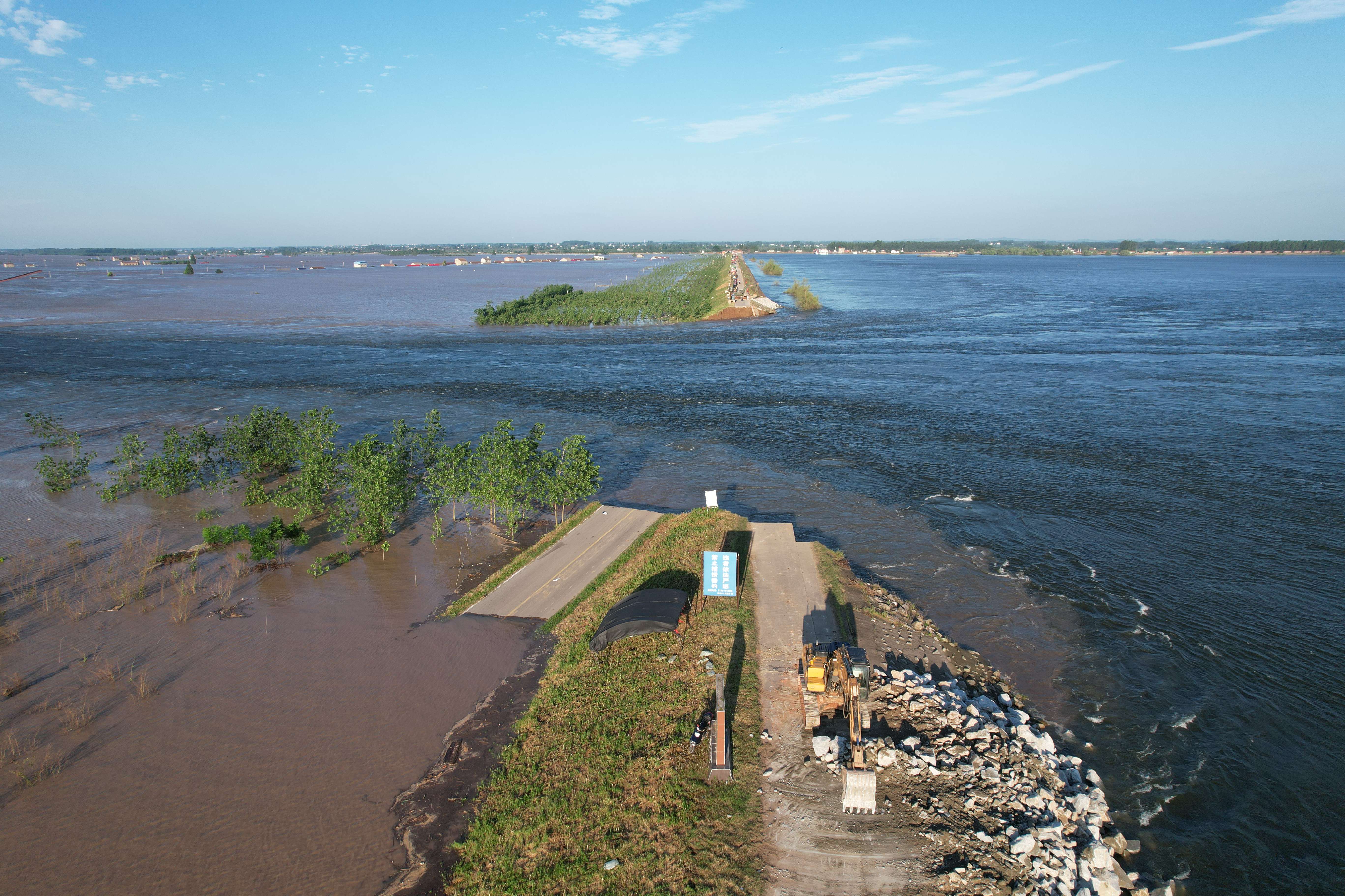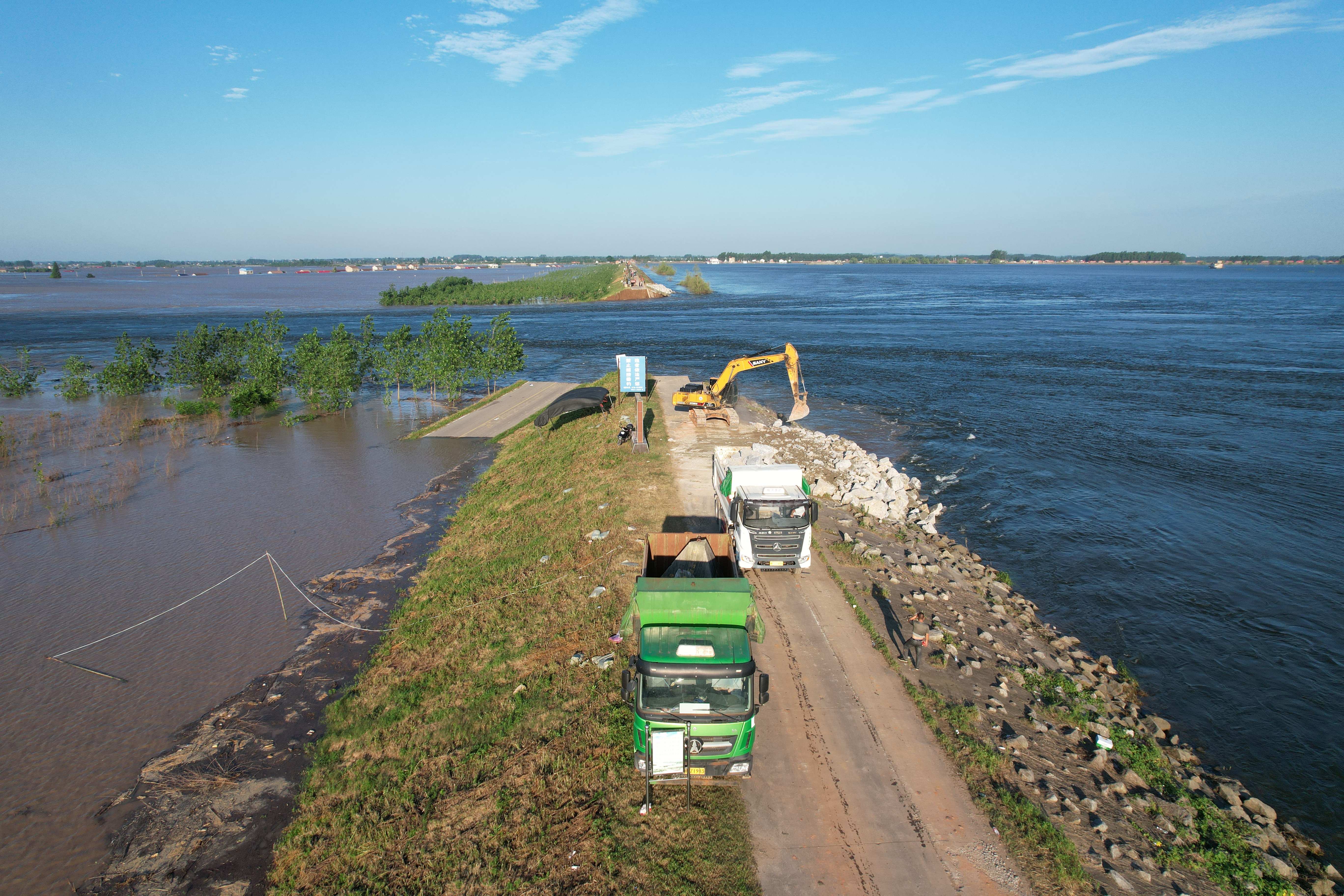 目前,前線正加緊組織工程機(jī)械加緊施工,在決口兩端建設(shè)4個倒車平臺,并在決口兩端傾倒大型石塊,建設(shè)‘裹頭’,減緩水流對決口沖刷,防止決口擴(kuò)大。