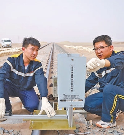 臺(tái)欣龍(右)和同事在對(duì)紅外線軸溫探測(cè)設(shè)備探頭進(jìn)行方位角矯正。