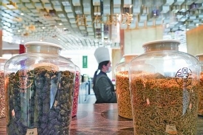 北京同仁堂知嘛健康零號(hào)店餐廳內(nèi)擺放的草本食材。新華社發(fā)