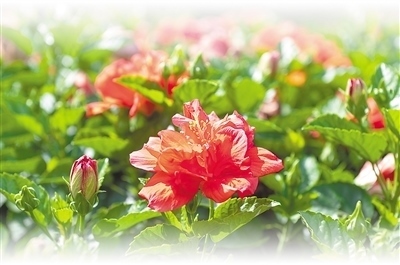 朱槿花大色艷,花蕊細長伸出于花瓣之外,花柱五裂,柱頭如粉球,花形俏麗喜慶,在我國兩廣地區(qū)被稱為“大紅花”,深受人們喜愛。在南寧,常見的朱槿花有十幾個品種,既有獨株高兩三米的小喬木、適合密植為樹籬的灌木,也有適合庭院、窗臺精巧布置的盆栽。