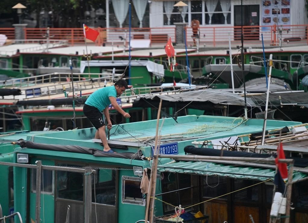 9月6日,在廣西北海市僑港鎮(zhèn)電建漁港碼頭,漁民在加固船只,準(zhǔn)備撤離上岸。新華社記者 黃孝邦 攝