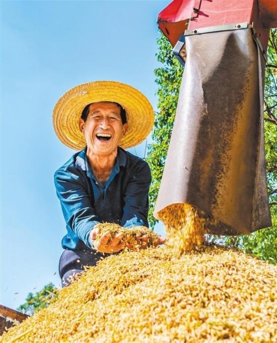 10月10日,湖南省東安縣紫溪市鎮(zhèn)中心村,農(nóng)民在高標準農(nóng)田收獲晚稻。今年前三季度,全國夏糧早稻產(chǎn)量合計17795萬噸,比上年增加346萬噸,增長2.0%。蔡小平攝(中經(jīng)視覺)