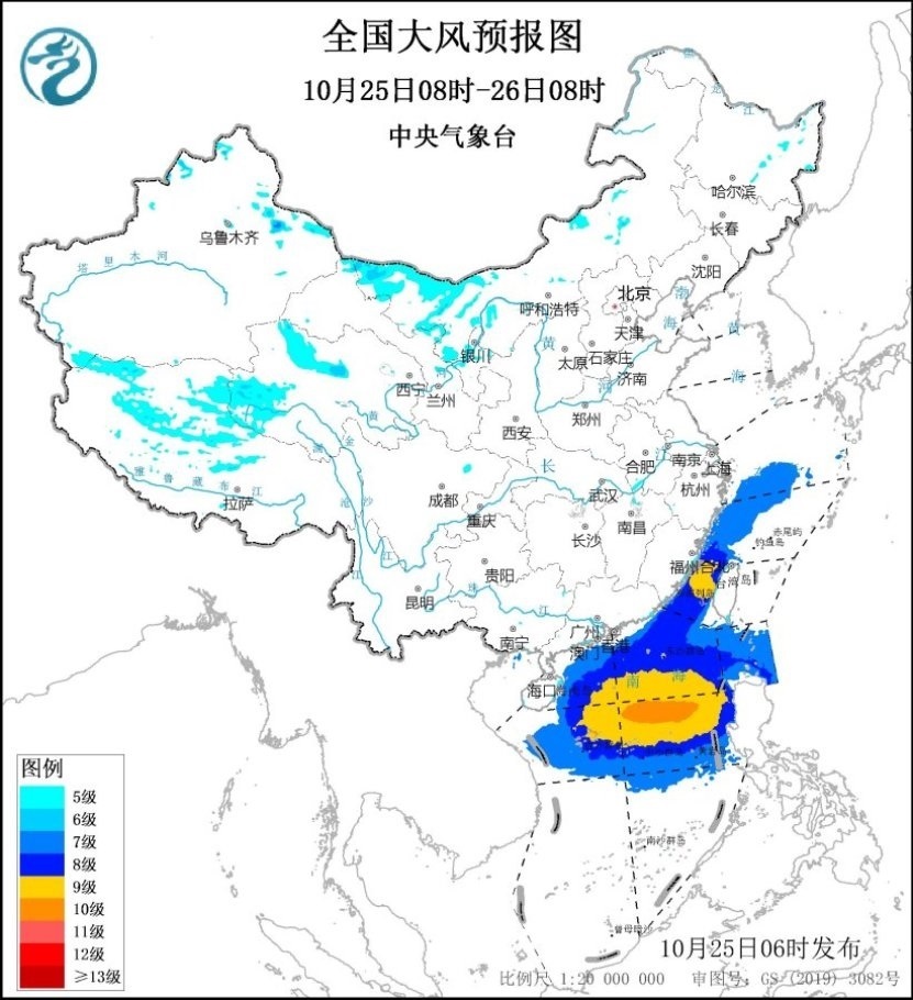 未來24小時,東海西部海域、臺灣海峽、南海北部和中部海域、巴士海峽、東沙群島、中沙群島、西沙群島將有7~9級、陣風(fēng)10~11級的大風(fēng),其中南海中東部的部分海域風(fēng)力可達10級、陣風(fēng)11~12級。
