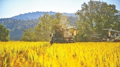 江西黎川縣的稻田里,收割機(jī)在前,“吞”入一串串飽滿的稻穗;村民在后,將一簇簇稻草扎成稻草束,整齊地立在田里晾曬。