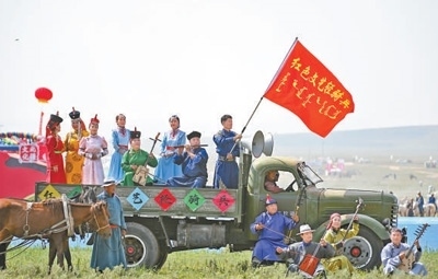 滋潤人心“紅色文藝輕騎兵”烏蘭牧騎隊員在內蒙古草原那達慕開幕式上表演。新華社記者 貝 赫攝
