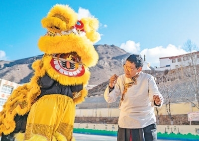 凝聚人心融合了漢藏特色表演形式的碩督鎮(zhèn)獅子舞,見證著西藏各民族交往交流交融的歷史。鄧巴阿尼是西藏昌都市非物質文化遺產(chǎn)碩督鎮(zhèn)獅子舞的傳承人,近年來致力于獅子舞傳承。圖為鄧巴阿尼(右)在昌都市洛隆縣碩督鎮(zhèn)小學指導學生跳獅子舞。新華社記者 丁增尼達攝