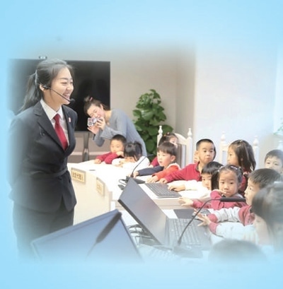 北京三中院組織開放日活動,法院干警(左一)為前來參觀的“小客人”介紹少年法庭。馬國強(qiáng)攝