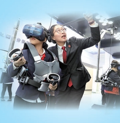 在浙江湖州市南潯區(qū)未成年人道德法治體驗(yàn)館,南潯區(qū)人民法院法官(右一)指導(dǎo)小學(xué)生運(yùn)用虛擬現(xiàn)實(shí)體驗(yàn)設(shè)備接受法治教育。項 飛攝