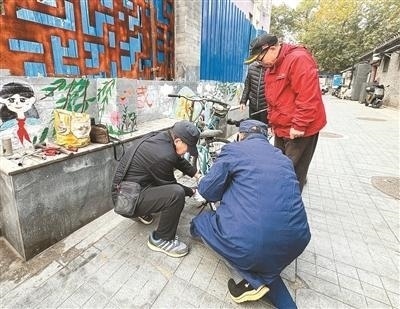 “幫把手公益服務(wù)隊(duì)”的于師傅(左二)為居民修理自行車。本報(bào)記者 霍旻含攝