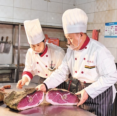 宣威市存香飯店,大廚徐天勇正忙著挑選食材,而烏金豬是制作宣威火腿的最佳原料?!半缰七^(guò)程也很重要,鹽的比例要恰到好處,多一分則咸,少一分則不夠味,經(jīng)過(guò)兩三年發(fā)酵,火腿就可以達(dá)到生吃的標(biāo)準(zhǔn)了。”徐天勇用骨針輕輕插入火腿的上、中、下部,火腿肉質(zhì)清香撲鼻,“就是它了?!?/p>