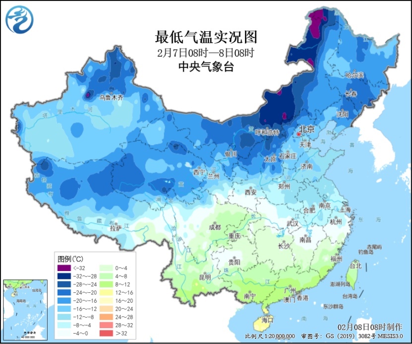 人民網(wǎng)北京2月8日電 (溫璐、高清揚)據(jù)中央氣象臺消息,昨日,受寒潮影響,內(nèi)蒙古中東部、華北、黃淮、江淮、江南北部及青藏高原等地部分地區(qū)出現(xiàn)大風(fēng)天氣,陣風(fēng)風(fēng)力有6~9級,內(nèi)蒙古、北京、河北、山西、山東、浙江及青海、西藏等局地風(fēng)力達10~12級。同時,北方大部地區(qū)經(jīng)歷入冬以來最冷一天,內(nèi)蒙古呼和浩特最低氣溫-26.5℃。今晨,河南南部、安徽、江蘇中南部、上海、浙江中北部、江西北部、湖北北部及內(nèi)蒙古東北部、黑龍江西北部等地出現(xiàn)6~10℃降溫,局地降溫幅度超過12℃。