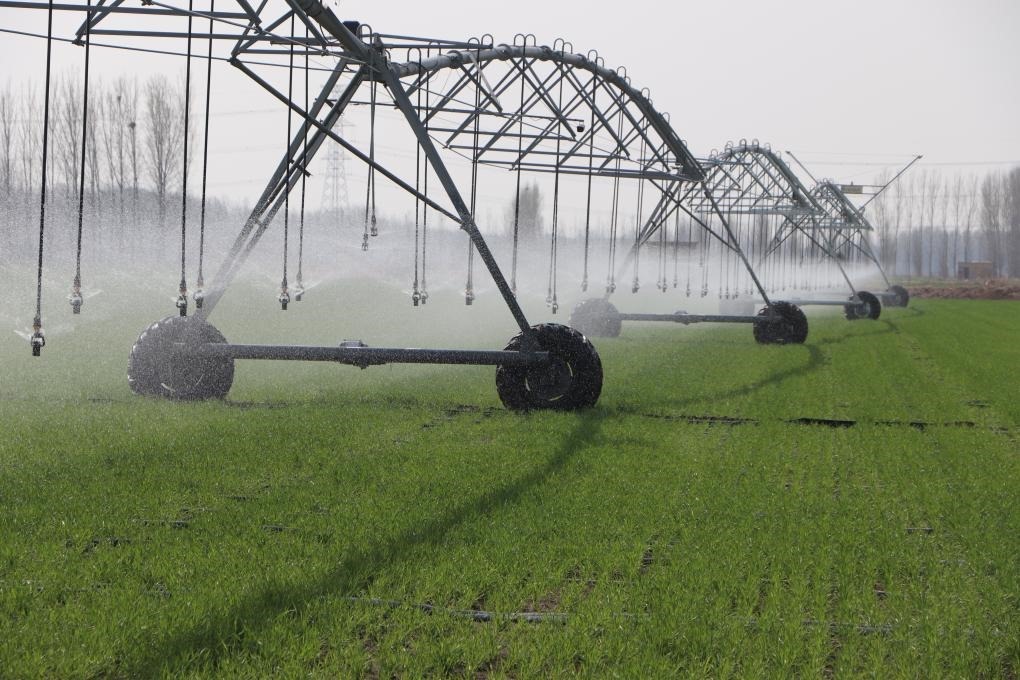 圖為種糧大戶使用自動(dòng)噴灌設(shè)備給麥田澆水。(張靜 攝)