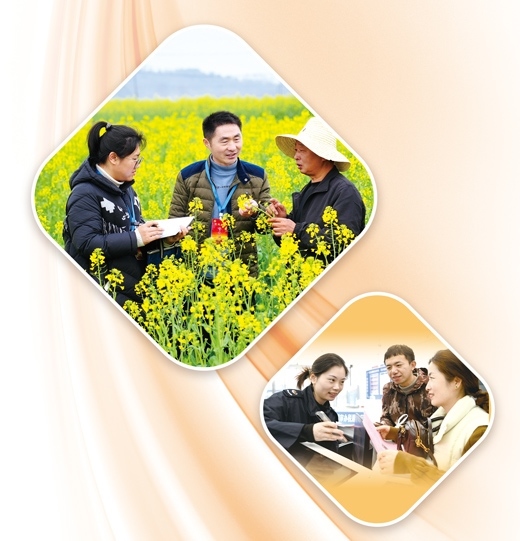 上圖:江西省上高縣錦江鎮(zhèn)團結(jié)村油菜花種植基地中,黨員干部(左、中)正在了解春耕情況。