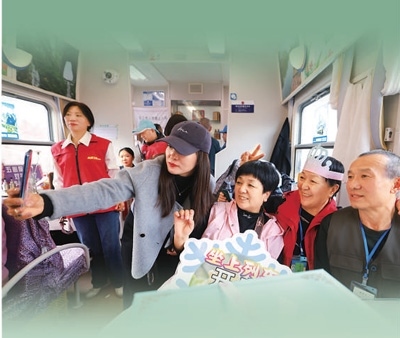 為讓銀發(fā)旅游更加精彩,銀發(fā)旅游列車(chē)不僅注重適老化改造,還通過(guò)特色主題表演,為老年游客帶來(lái)豐富的旅行體驗(yàn)。在Y471次熊貓旅游專列上,游客們可以欣賞到別具特色的川劇變臉。在黑龍江的冰雪旅拍主題旅游列車(chē)上,車(chē)廂內(nèi)融合哈爾濱各類景點(diǎn)進(jìn)行主題場(chǎng)景設(shè)計(jì),老年游客只需掃碼預(yù)約便可換上不同風(fēng)格的服裝在車(chē)廂內(nèi)拍照打卡。列車(chē)上,老年游客不僅樂(lè)趣十足,還留下許多美好回憶。