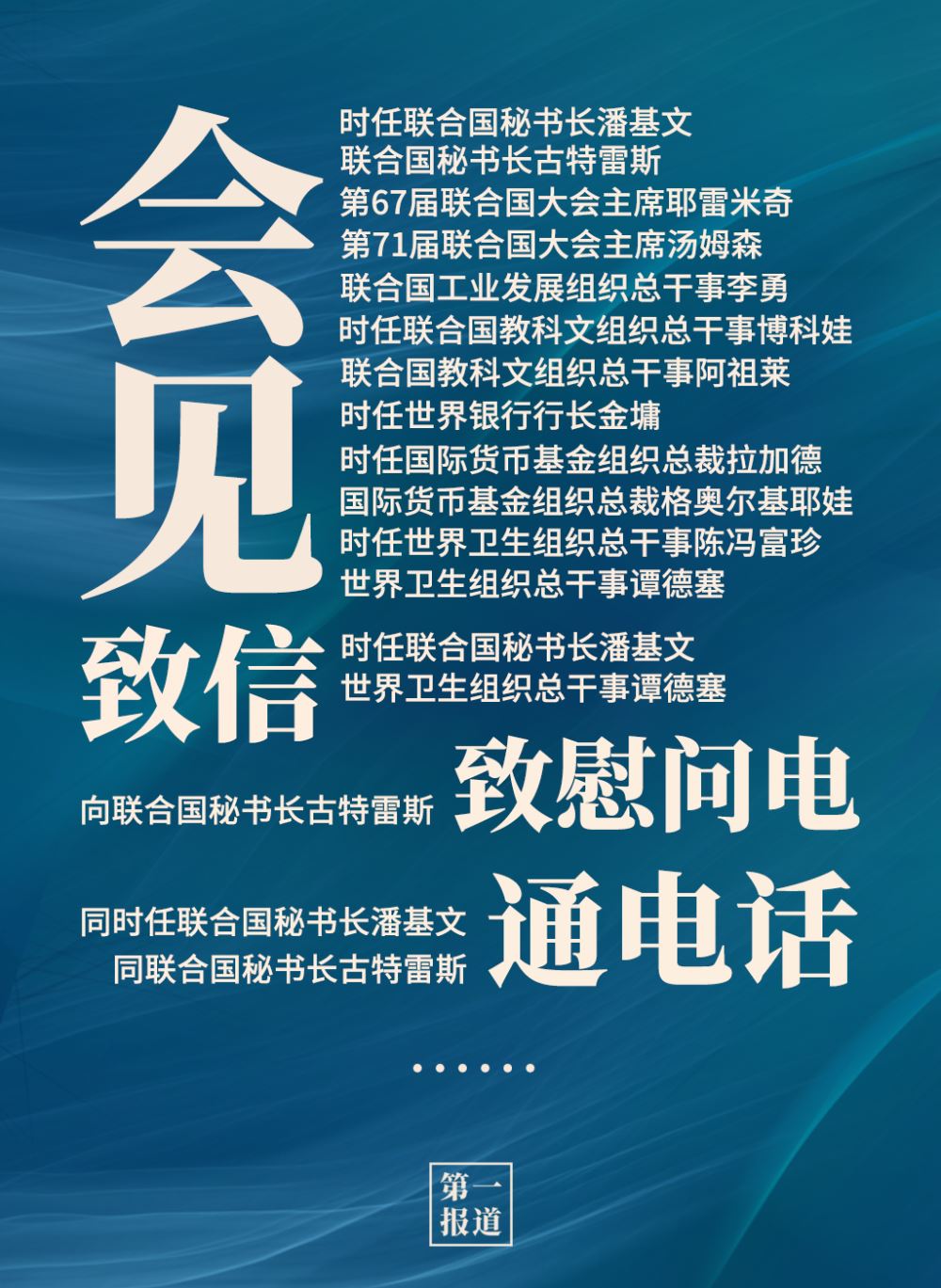 2013年以來,習(xí)主席通過會見、通話、致信函等多種方式同聯(lián)合國主要官員保持密切溝通?;訉ο蟀?lián)合國秘書長、聯(lián)合國大會主席,還有聯(lián)合國工業(yè)發(fā)展組織、聯(lián)合國教科文組織、世界銀行、國際貨幣基金組織、世界衛(wèi)生組織等聯(lián)合國專門機構(gòu)主要負責(zé)人。