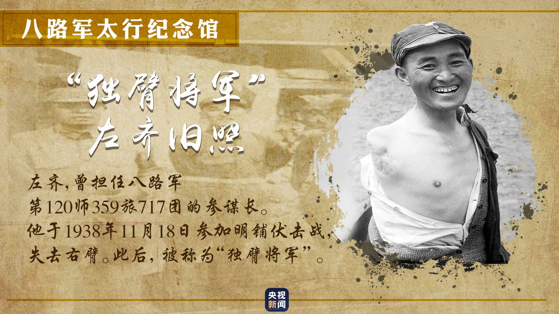 一張獨臂將軍的舊照,展現(xiàn)出八路軍為爭取民族獨立,不怕犧牲、不畏艱險的革命英雄主義精神。