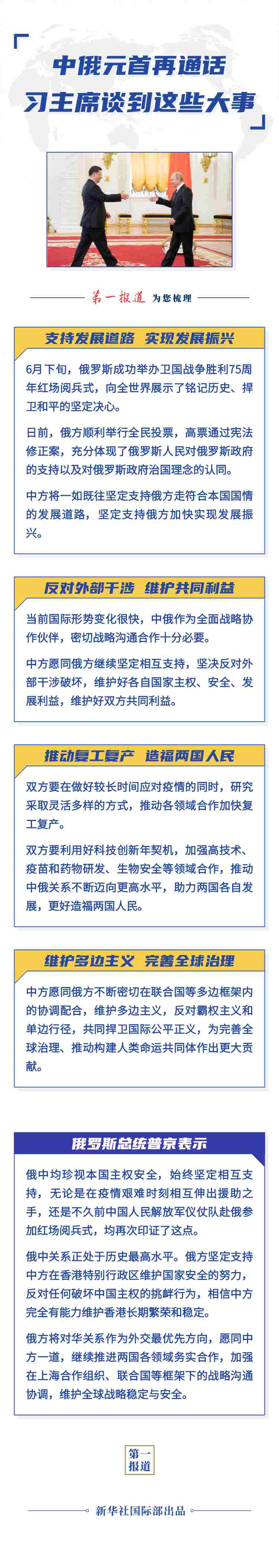 普京表示,近日俄羅斯全民投票高票通過(guò)憲法修正案,有助于維護(hù)俄長(zhǎng)期政治穩(wěn)定,更好捍衛(wèi)國(guó)家主權(quán),反對(duì)外部干涉。俄中均珍視本國(guó)主權(quán)安全,始終堅(jiān)定相互支持,無(wú)論是在疫情艱難時(shí)刻相互伸出援助之手,還是不久前中國(guó)人民解放軍儀仗隊(duì)赴俄參加紅場(chǎng)閱兵式,均再次印證了這點(diǎn)。俄中關(guān)系正處于歷史最高水平。俄方堅(jiān)定支持中方在香港特別行政區(qū)維護(hù)國(guó)家安全的努力,反對(duì)任何破壞中國(guó)主權(quán)的挑釁行為,相信中方完全有能力維護(hù)香港長(zhǎng)期繁榮和穩(wěn)定。俄方將對(duì)華關(guān)系作為外交最優(yōu)先方向,愿同中方一道,繼續(xù)推進(jìn)兩國(guó)各領(lǐng)域務(wù)實(shí)合作,加強(qiáng)在上海合作組織、聯(lián)合國(guó)等框架下的戰(zhàn)略溝通協(xié)調(diào),維護(hù)全球戰(zhàn)略穩(wěn)定與安全。