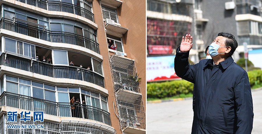 3月10日,習近平專門赴湖北省武漢市考察新冠肺炎疫情防控工作。這是習近平在東湖新城社區(qū)考察時,向在家隔離居住的居民揮手致意、表示慰問(拼版照片)。