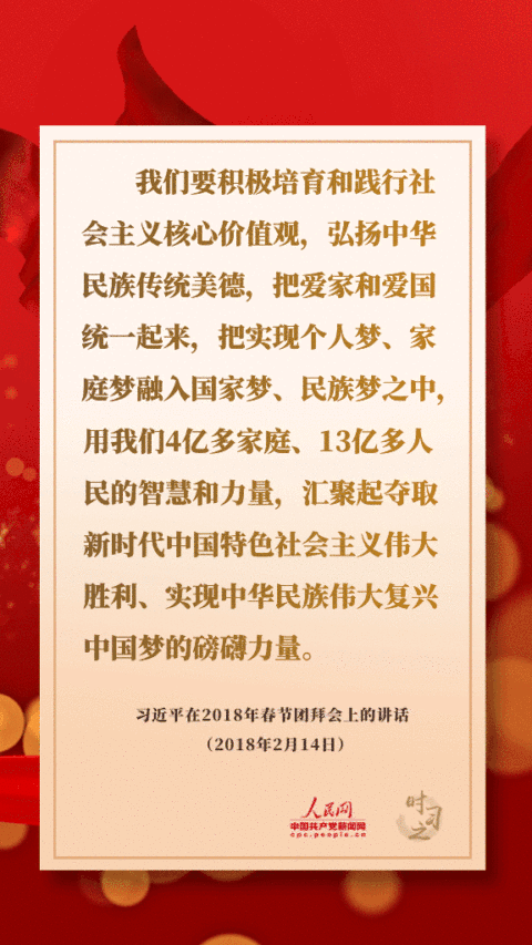 我們要積極培育和踐行社會主義核心價值觀,弘揚(yáng)中華民族傳統(tǒng)美德,把愛家和愛國統(tǒng)一起來,把實(shí)現(xiàn)個人夢、家庭夢融入國家夢、民族夢之中,用我們4億多家庭、13億多人民的智慧和力量,匯聚起奪取新時代中國特色社會主義偉大勝利、實(shí)現(xiàn)中華民族偉大復(fù)興中國夢的磅礴力量。