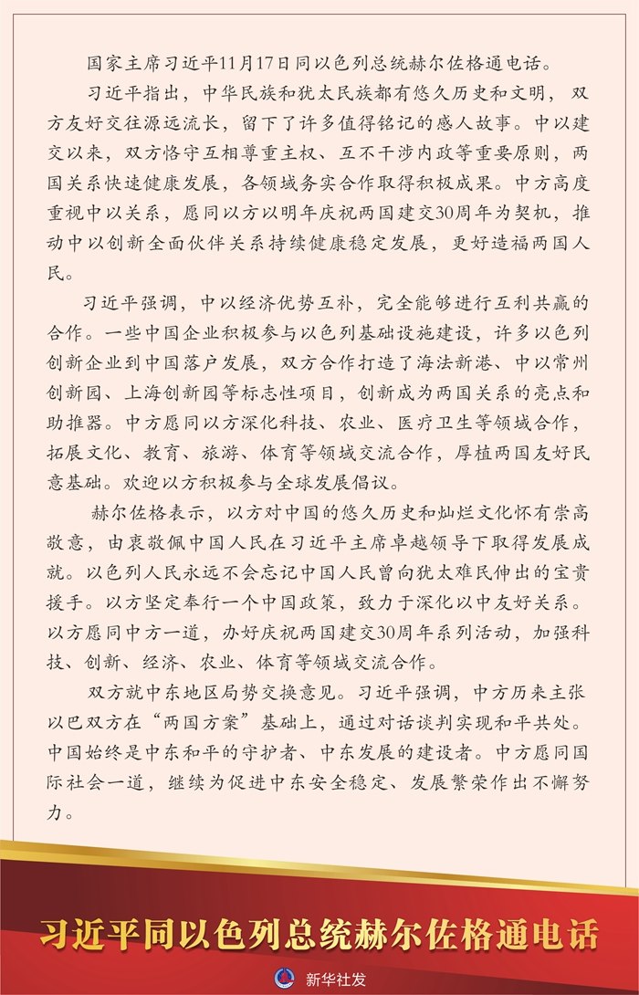新華社北京11月17日電國(guó)家主席習(xí)近平11月17日同以色列總統(tǒng)赫爾佐格通電話。