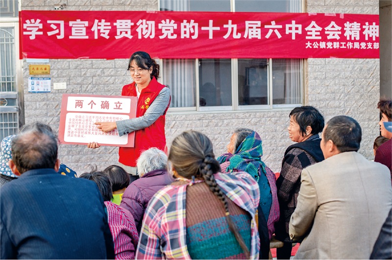 2021年11月18日,江蘇省南通市海安市大公鎮(zhèn)黨員志愿者在常河村12組向村民宣傳黨的十九屆六中全會(huì)精神,用老百姓聽得懂、能領(lǐng)會(huì)的方式將全會(huì)精神傳達(dá)到基層。人民視覺(jué)翟慧勇/攝