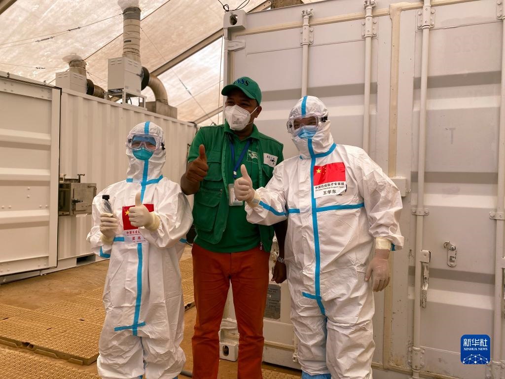 2020年9月2日,在幾內(nèi)亞首都科納克里一個(gè)核酸檢測(cè)取樣點(diǎn),中國抗疫醫(yī)療專家組成員與當(dāng)?shù)毓ぷ魅藛T合影。新華社發(fā)(專家組供圖)