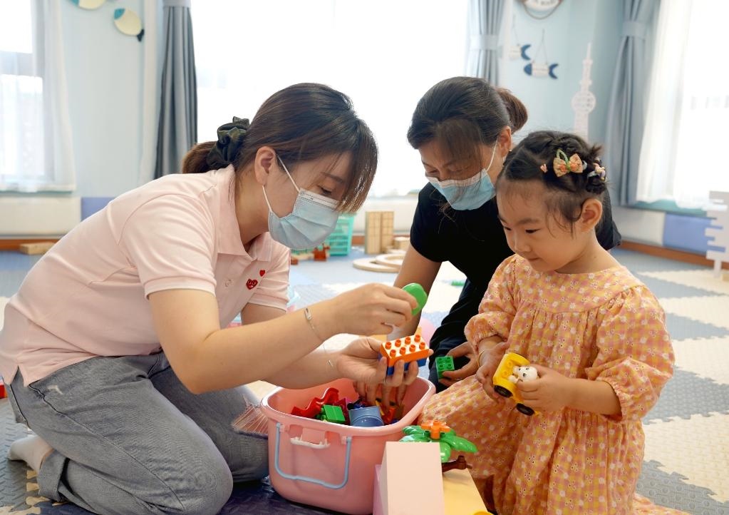 7月14日,在奉賢區(qū)奉浦街道秦塘生活驛站,早教老師在指導(dǎo)小朋友玩游戲。新華社記者 劉穎 攝