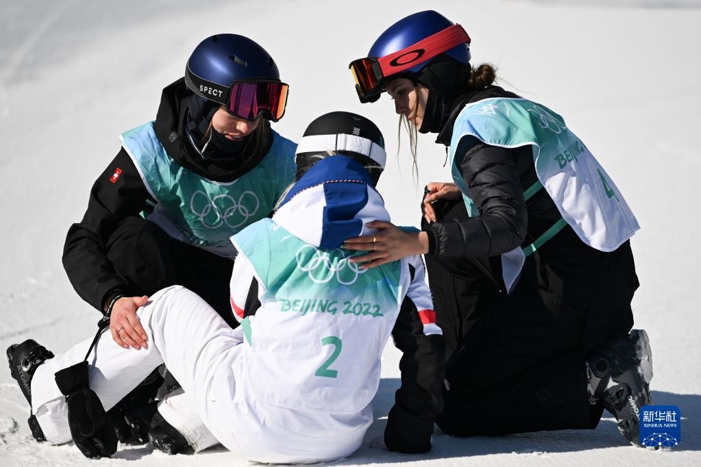 2月8日,中國(guó)選手谷愛(ài)凌(右)和瑞士選手瑪?shù)贍柕隆じ窭啄拢ㄗ螅┰谧杂墒交┡哟筇_(tái)決賽后安慰法國(guó)選手泰絲·勒德。新華社記者 薛宇舸 攝