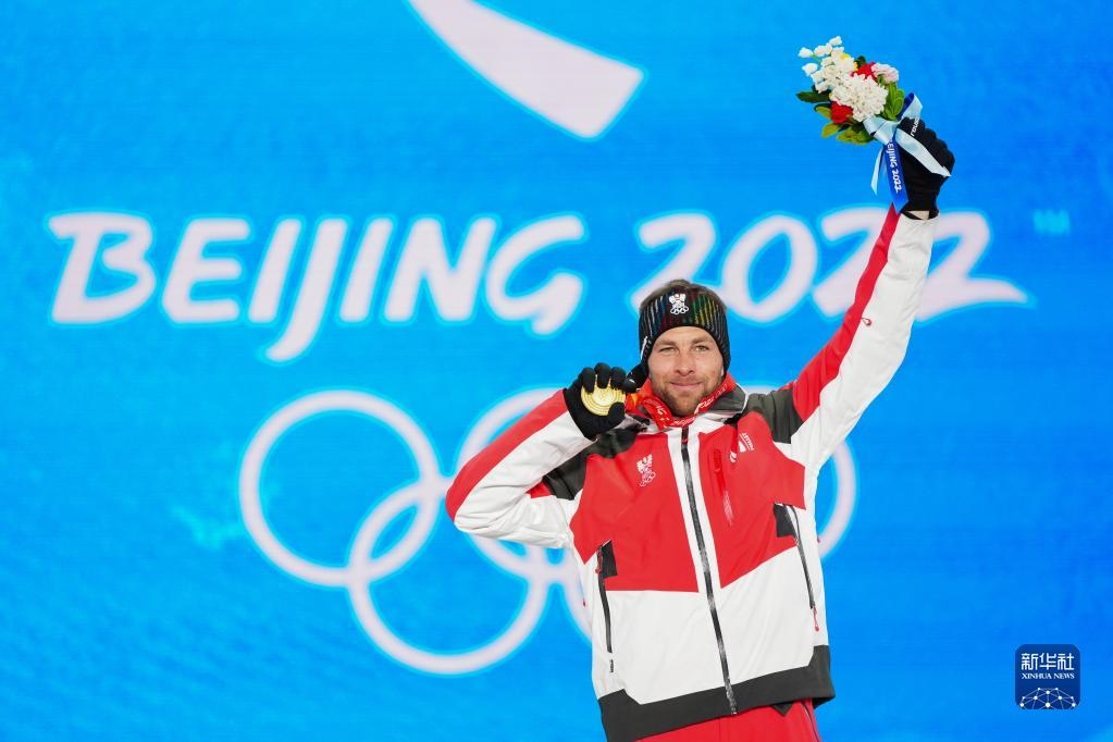 2月8日,單板滑雪男子平行大回轉(zhuǎn)比賽冠軍、奧地利選手本亞明·卡爾在獎(jiǎng)牌頒發(fā)儀式上。新華社記者 朱崢 攝