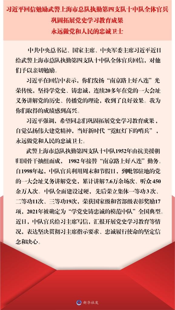 武警上海市總隊(duì)執(zhí)勤第四支隊(duì)十中隊(duì)1952年由抗美援朝歸國骨干抽組而成,1982年接替“南京路上好八連”勤務(wù)。自1998年起,中隊(duì)官兵利用周末和節(jié)假日,到毗鄰駐地的黨的一大會(huì)址義務(wù)講解黨史,累計(jì)講解7.6萬余場次、聽眾450余萬人次。中隊(duì)全面建設(shè)過硬,先后榮立集體一等功3次、二等功11次、三等功19次,榮獲國家級(jí)和省部級(jí)表彰獎(jiǎng)勵(lì)17項(xiàng),2021年被確定為“學(xué)黨史鑄忠誠的模范中隊(duì)”全國典型。近日,中隊(duì)官兵給習(xí)主席寫信,匯報(bào)開展黨史學(xué)習(xí)教育等情況,表達(dá)堅(jiān)決貫徹習(xí)主席指示要求、忠誠履行使命的堅(jiān)定信念和決心。