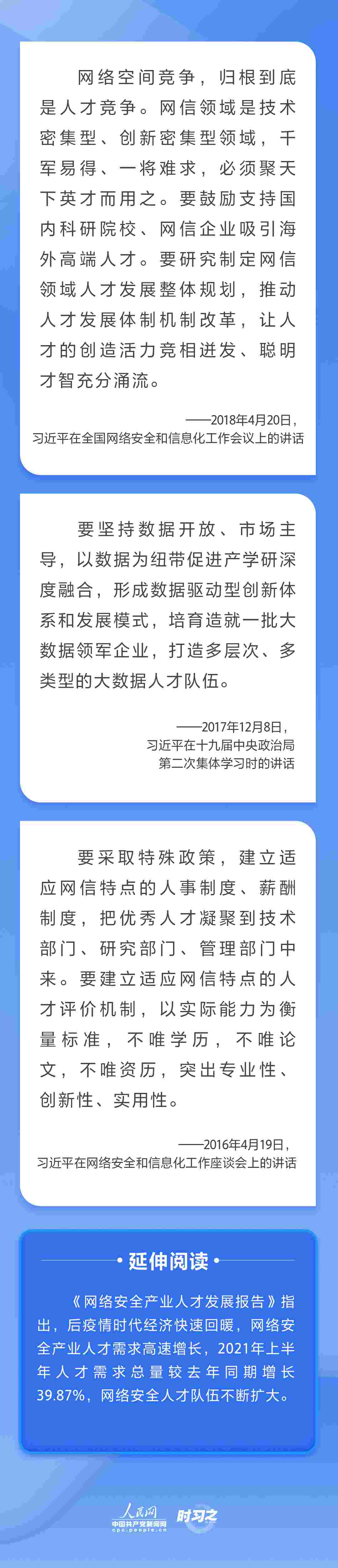 “網(wǎng)信領(lǐng)域是技術(shù)密集型、創(chuàng)新密集型領(lǐng)域,千軍易得、一將難求,必須聚天下英才而用之?!秉h的十八大以來(lái),習(xí)近平總書記多次就網(wǎng)信事業(yè)發(fā)展作出重要論述,并將抓好人才工作擺在治國(guó)理政的重要位置,為新時(shí)代網(wǎng)信人才工作和網(wǎng)信人才事業(yè)發(fā)展指明了前進(jìn)方向。